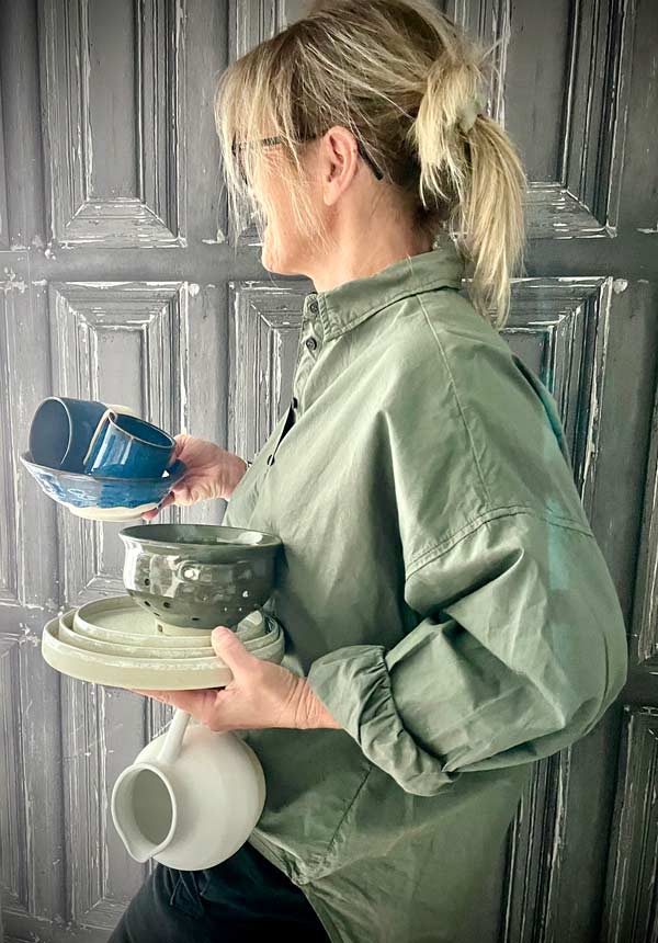 La première fois que j’ai posé mes mains sur un tour de potier, en 2021, ce fut une révélation : la douceur de la terre, le mouvement circulaire du tour qui « massait » les doigts, quelles sensations incroyables! J’ai donc voulu me former par des stages, des cours réguliers et beaucoup, beaucoup d’entrainement sur mon tour. Maintenant que j’en ai fais mon métier, (après avoir été infirmière) je souhaite que ceux qui en ont envie découvrent à leur tour ces sensations lors de cours ponctuels et/ ou lors de sessions plus approfondies tout au long de l’année.