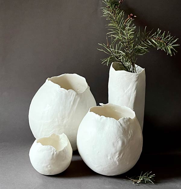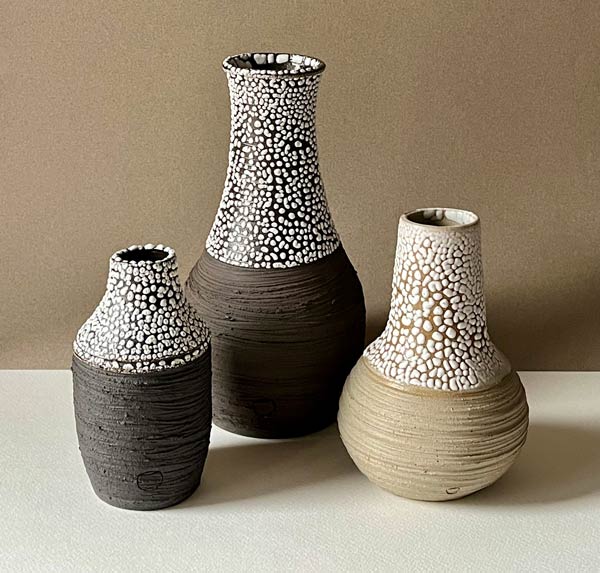 I work with stoneware and porcelain, two clays that are very different in texture and final appearance. I like to leave part of each piece unglazed; the tactile contrast is especially pleasing.