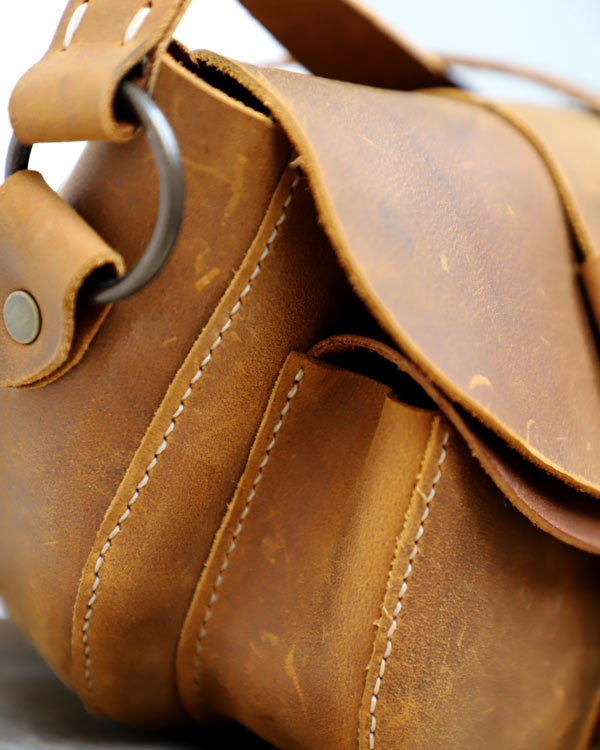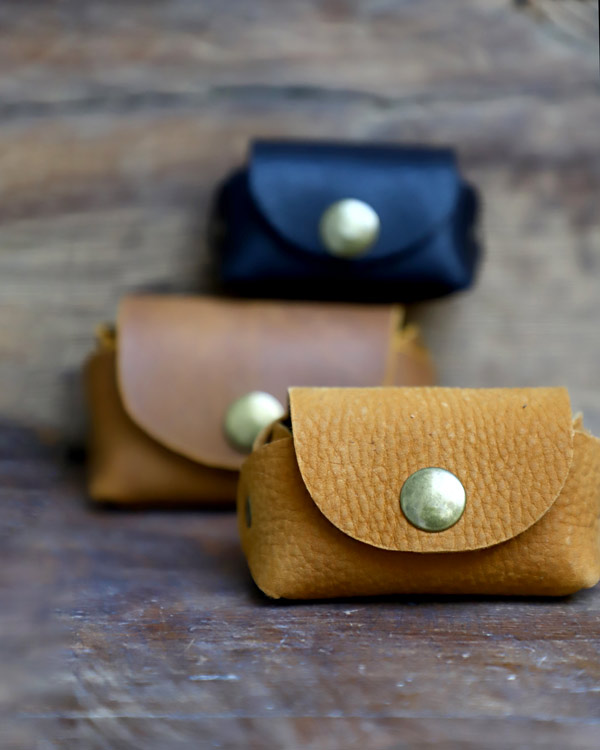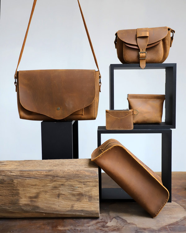 Je réalise des articles en cuir pour femmes et hommes : sacs à main, bracelets, trousses, sacoches, portefeuilles… Toutes les pièces sont fabriquées en petites séries et entièrement cousues à la main selon la technique traditionnelle du point sellier. Ce point utilise un fil avec une aiguille à chaque extrémité, les deux aiguilles passant dans un même trou depuis des côtés opposés, créant une couture solide et symétrique. Si un fil venait à casser, la couture reste intacte.
