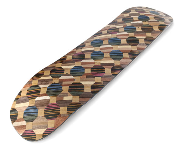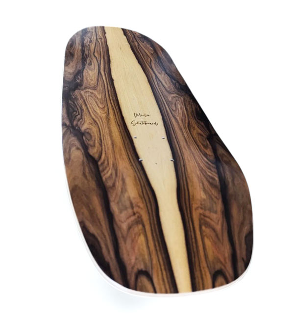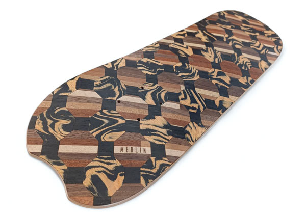 His work stands out for its meticulous attention to detail, particularly through the use of veneers, marquetry, and the enhancement of different wood species. Each board is conceived as a unique piece, where the balance between technical performance, aesthetics, and respect for the material is essential. Tom is committed to elevating the wood — revealing its natural grain or, conversely, exploring bold, asymmetrical, and colorful graphic compositions.