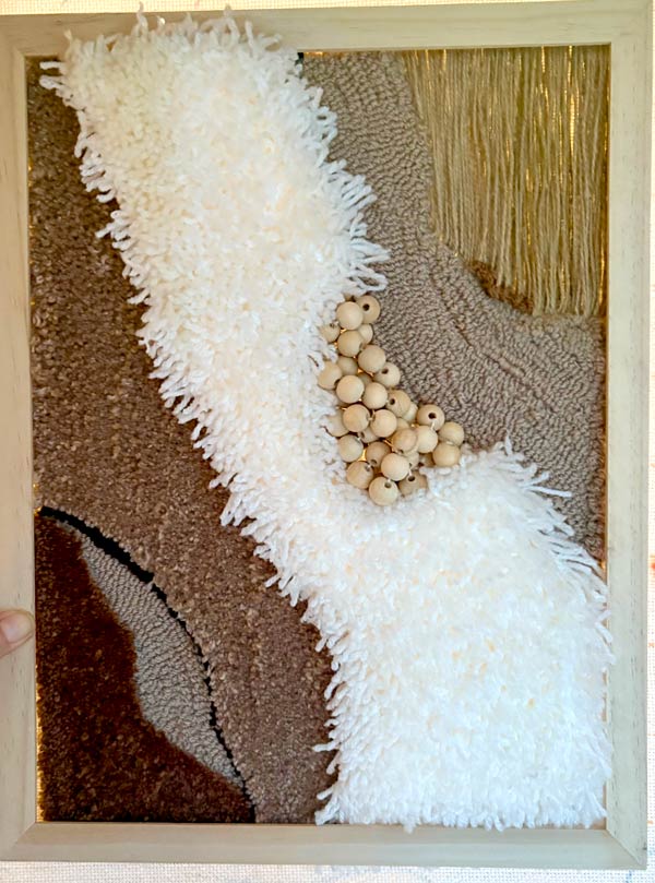 Quand tu as terminé, tu encolles l’arrière pour fixer les fibres. Après l’atelier, je m’occupe des finitions à voir avec toi si c’est une décoration murale ou un tapis. Tu pourras récupérer ton oeuvre 3 à 4 semaines après en boutique ou je te l’envoie selon les différents mode de livraison avec des frais supplémentaires. N’attends pas pour réserver ton atelier ! A très bientôt !